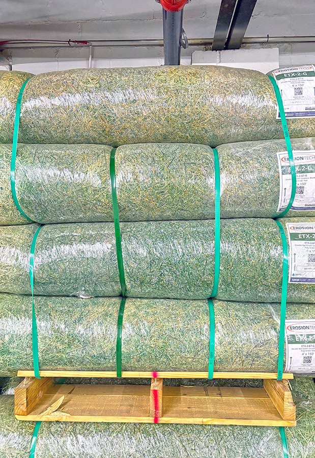 Erosiontech ETX-2-100 Green by MKB. Field longevity will be dictated by soil and climate conditions during install and length of your project. Comes in either 8’ or 16’ rolls at varying lengths (Refer to Specification Sheet for lengths and ASTM Data). All ErosionTech products are manufactured in the USA. Erosiontech ETX-2-100 Green consists of a 100% Straw stitched to a double photodegradable net on both top and bottom with straw in between. ETX-2 Green uses a photodegradable material with a lifespan of 9-12 months.