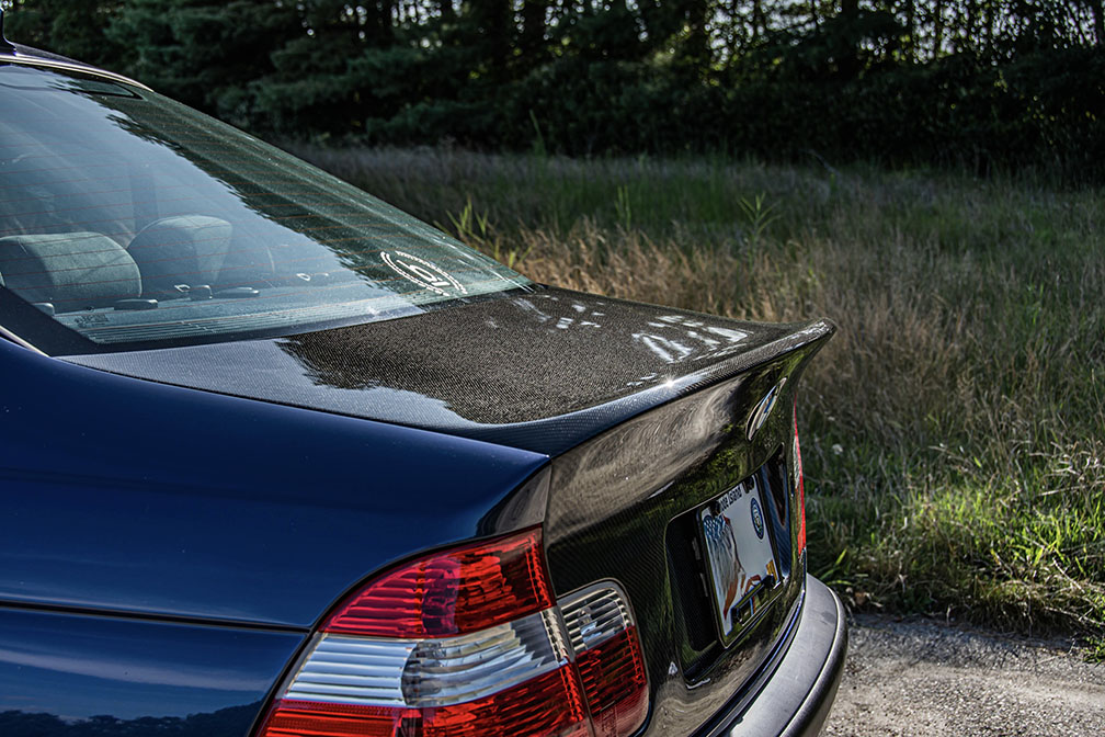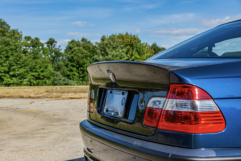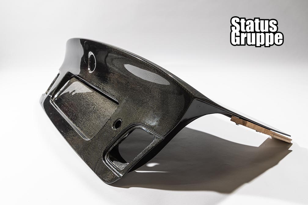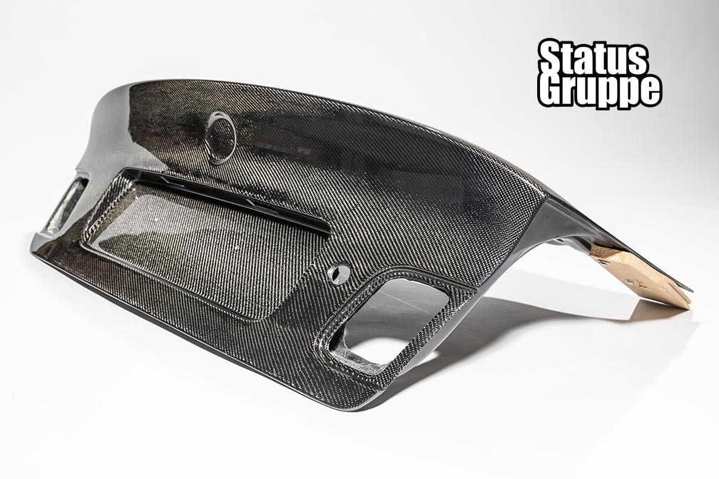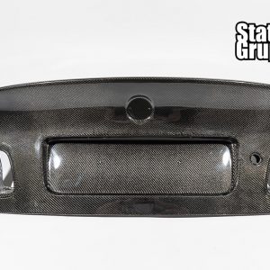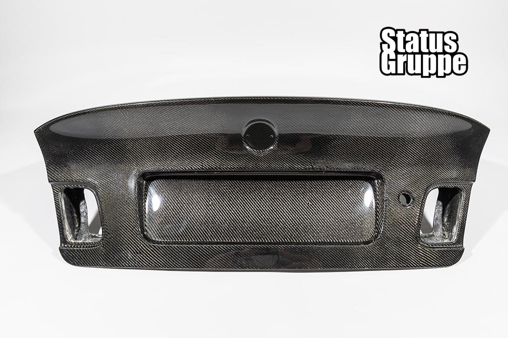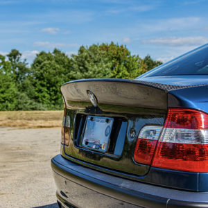 BMW E46 CSL Style 4 Door Sedan Carbon Fiber Trunk Lid. Our SGT Carbon fiber trunk is the closest to the original OEM CSL Trunk for the 4 door sedan available. Our Trunks are without handle (just like the OEM CSL Trunk) and without the fitment issues associated with other Non OEM trunks on the market. This version of our trunk lid is  available in FRP, Single sided carbon in both 2×2 and 1×1 weave with  (honey comb fiberglass inner portion) and weighs about 14lbs. The trunks will have keyhole spots but will not have any holes drilled for badges and etc, but there is dimples to mark the location of all necessary holes. Plate light holes are pre-cut but will not work with OEM lights as they are mounted in your stock trunk handle. We recommend the factory E9X LED lights (which we offer as an add-on) As with any Carbon fiber product we cannot guarantee perfect weave or shape of the trunk, but we think for the money it is one of the best CSL Rep trunks on the market today. Made in USA