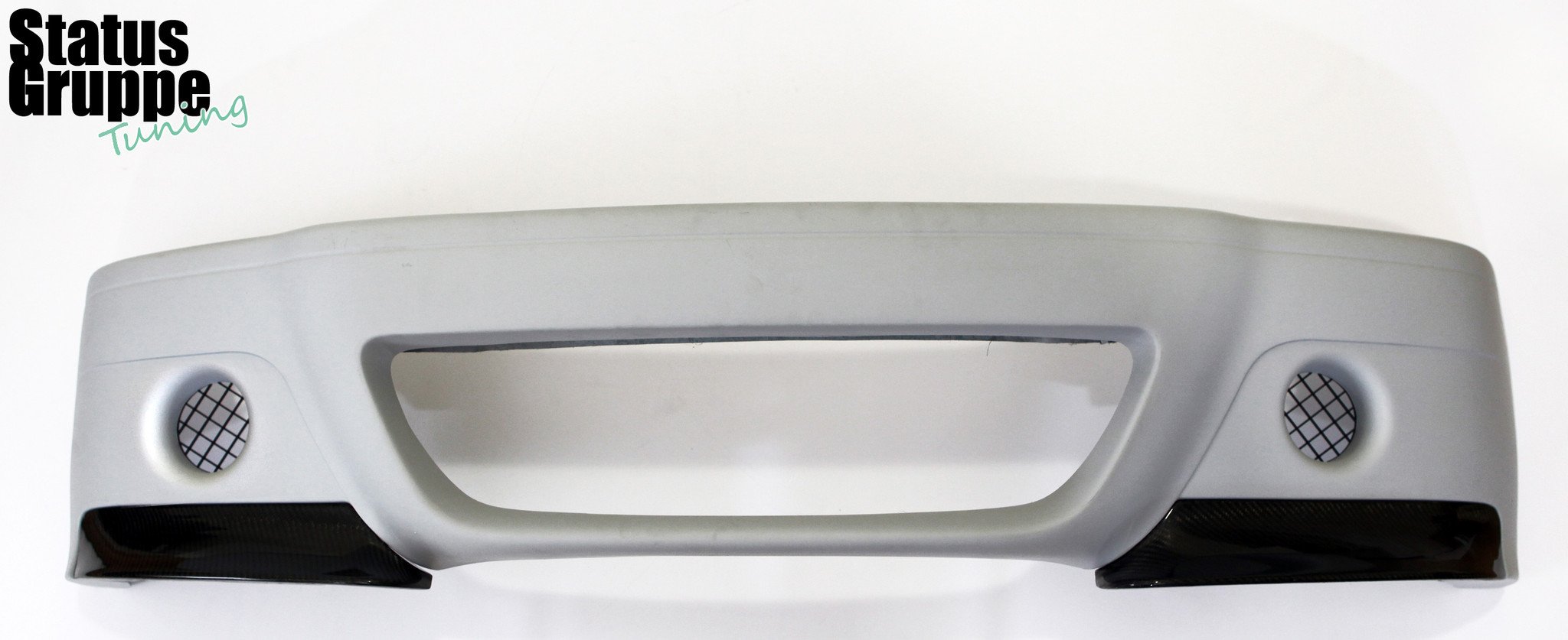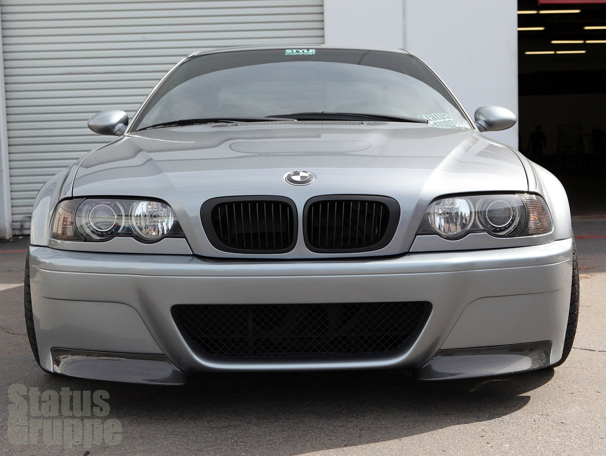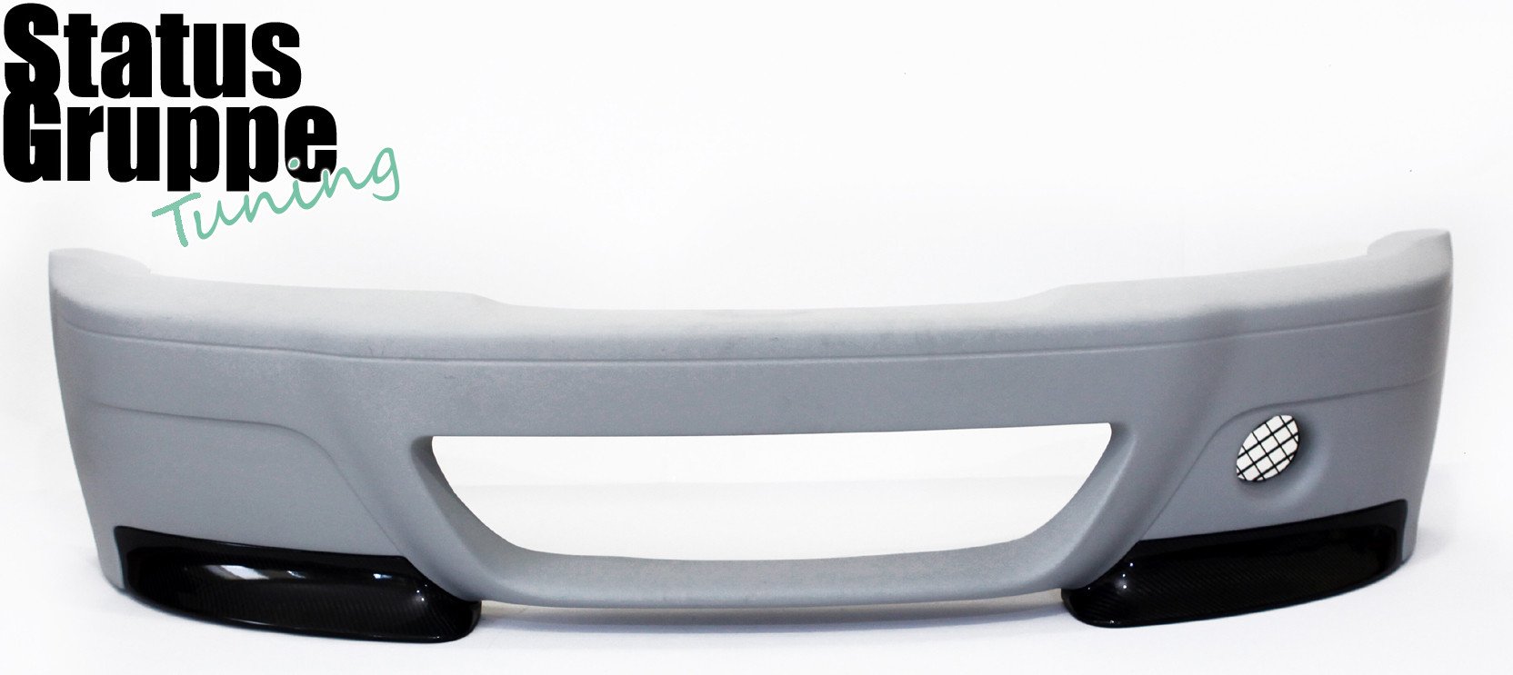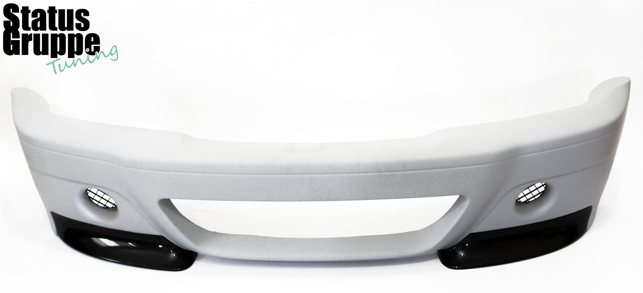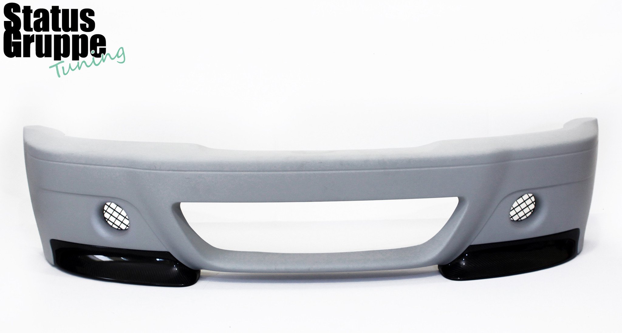 BMW E46 M3 CSL Style Front Bumper V2. The Status Gruppe CSL front bumper has gotten even better. Here are some things you will notice about the Status Gruppe V2 CSL bumper: There is now a built in reinforcement/mounting just like the OEM CSL,   We now have added some vertical adjustment allow for better fitment of the bumper overall, The side clips are now built into the bumper (so no need to remove the clips from the OEM bumper), we have also have improved the production and mold to be better trimmed for overall improved fitment. And like our original CSL Bumper they have a completely different front CF splitter system than OEM and hold up better to elements and higher speed driving conditions.