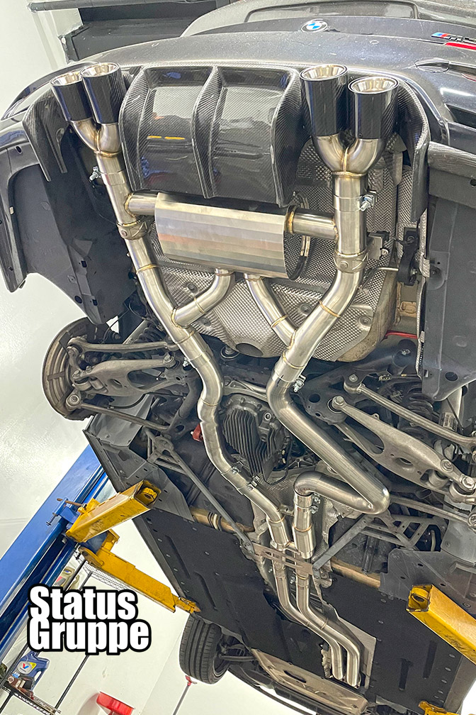 BMW F8X M3/M4 equal length exhaust system by Status Gruppe. New for 2023 The F80 M3 and F82/F83 M4 are amazing cars but the factory exhaust sound just doesn’t fit the aggressive looks and our new 304 stainless fully TIG welded equal length down pipe back exhaust system is the solution. Fits perfect and sounds amazing, great performance!