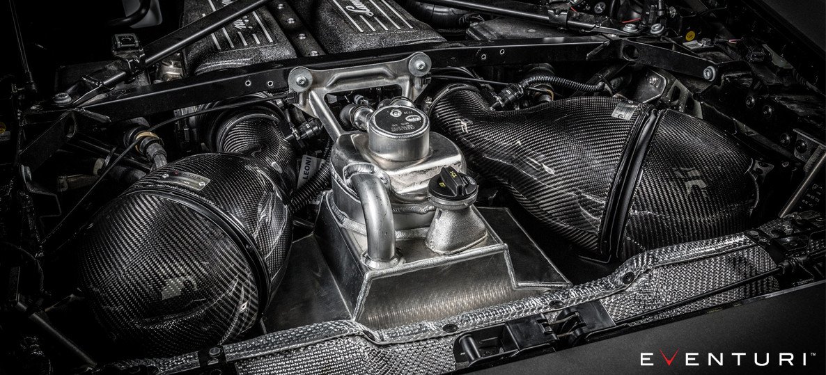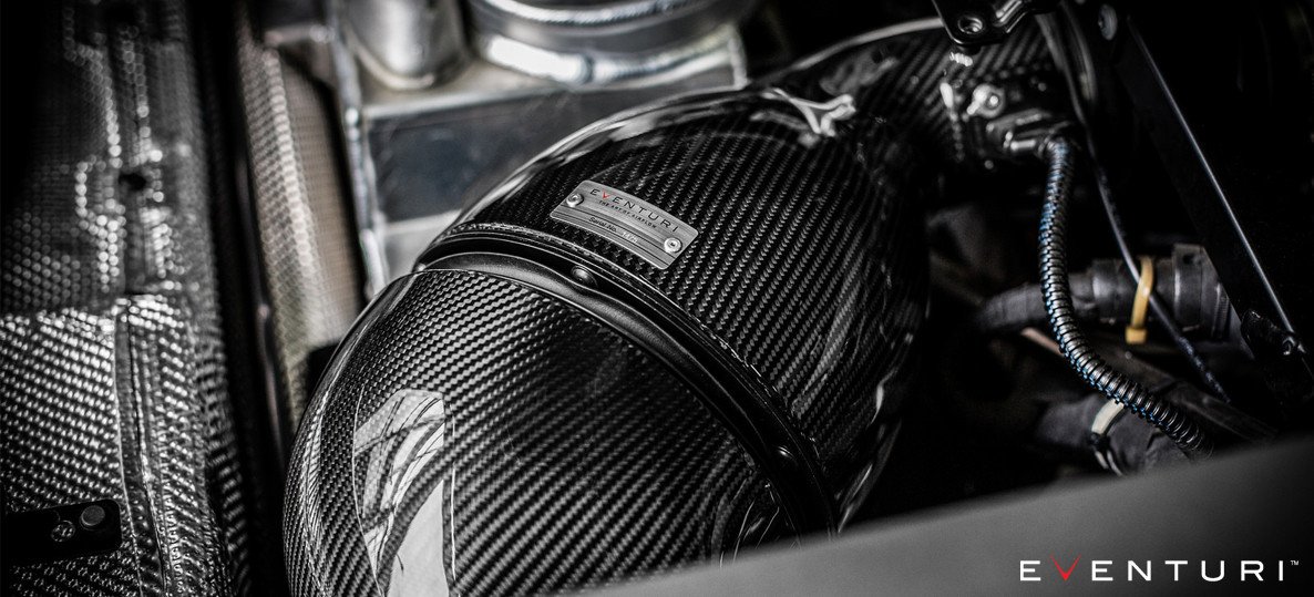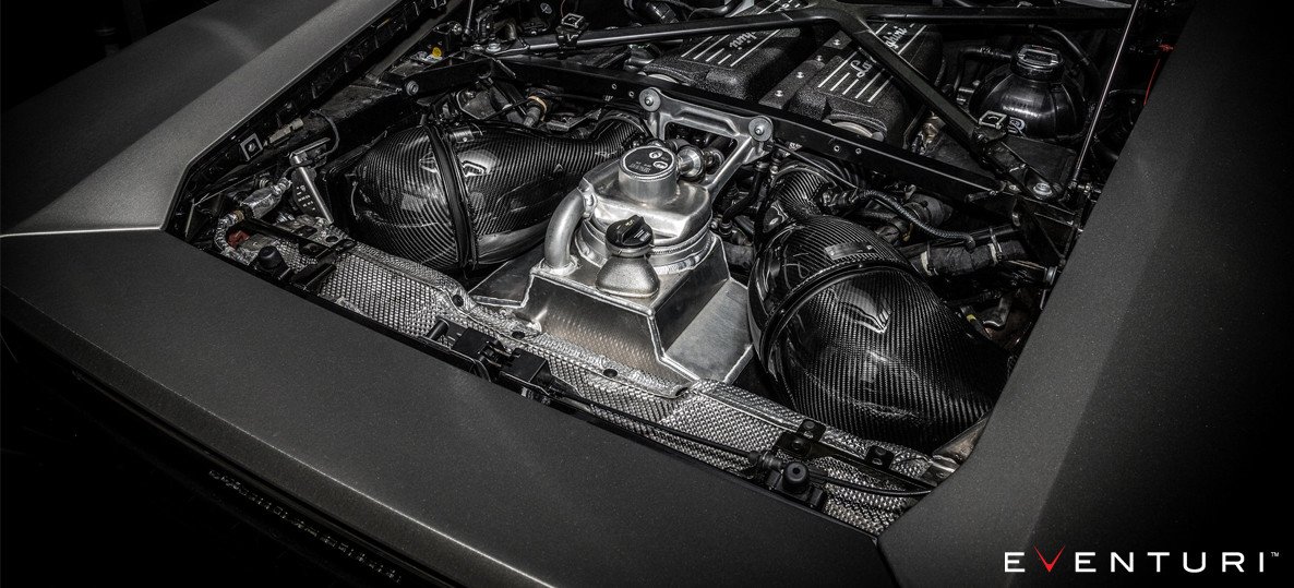 The Lamborghini Huracan Eventuri intake system – form and function in sublime harmony. Our aim was to create a flagship intake and set a benchmark for this platform – by using organic curves and prepreg carbon fibre the results speak for themselves. Gone are the awkward cuboid plastic airboxes and in their place is a beautifully engineered system which allows for smoother airflow and releases the glorious roar from the V10 engine. Every detail has been taken into account, from the flawless carbon fibre to the triple layer heat shields ensuring the engine receives cold air without restriction. More power, improved throttle response and an intoxicating induction sound…..benchmark set.